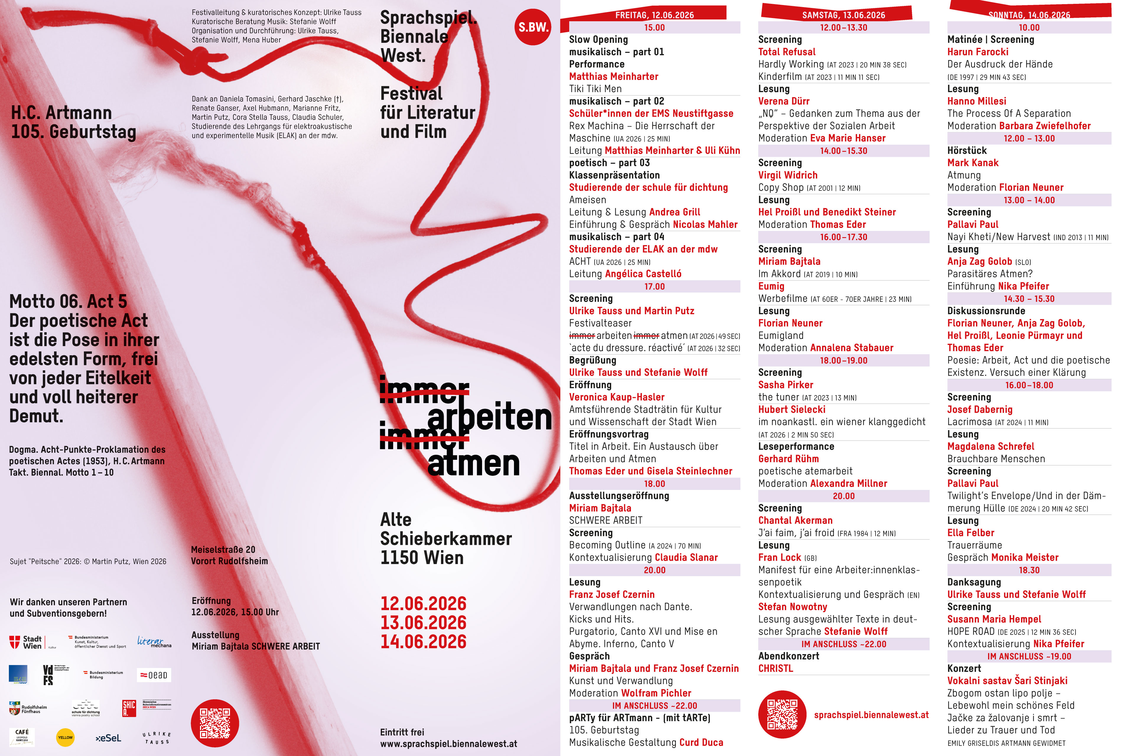 Unter dem Titel immer arbeiten immer atmen richtet Sprachspiel. Biennale West zum sechsten Mal ein dreitägiges Festival für Literatur und Film im Gedenken an H.C. Artmann und die Wiener Gruppe aus. Die Grundlage der biennalen Veranstaltungsserie bildet H.C. Artmanns Acht-Punkte-Proklamation des poetischen Actes aus dem Jahr 1953. Auf dem 5. Act der Proklamation basiert die diesjährige Ausgabe von Sprachspiel. Biennale West: